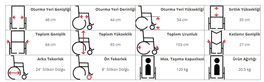 Kolçak: Hasta transferini kolaylaştırmak amacıyla geriye doğru hareketli kolçaklar, 5,5cm * 26,5 cm ölçülerinde vinleks kumaş kaplı anti-bakteriyel kol dayama yerleri.