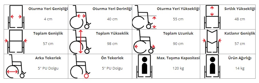 Demonte Özelliği Kolçakları açılabilir ve geriye tam katlanabilir. Ayak pedalları çıkartılabilir. Transfer için sırtı çıkabilir.